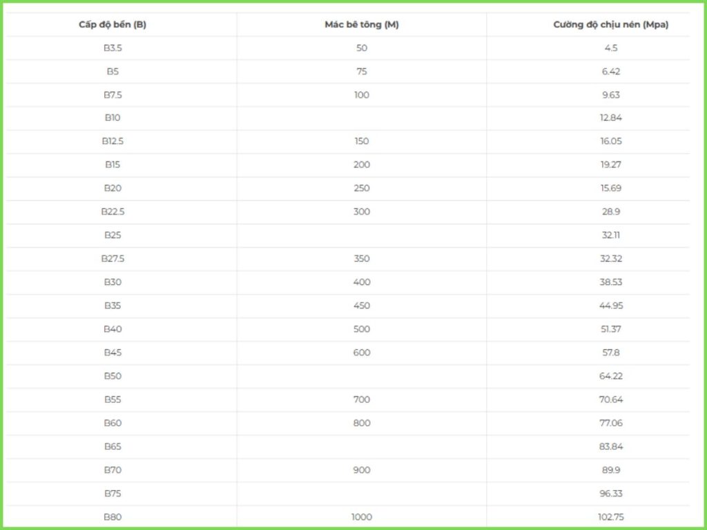 1. Bảng quy đổi Mác bê tông (M) và Cấp độ bền (B) tương ứng với cường độ chịu nén: